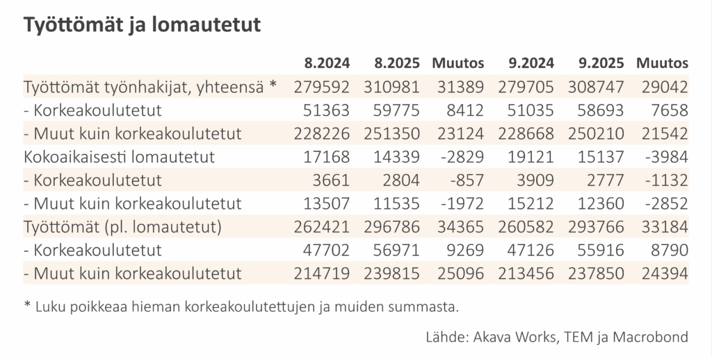 Työttömistä alemman korkeakoulututkinnon suorittaneita oli 17 624 (muutos vuoden aikana −16,0 %) ja ylemmän 14 283 (−16,3 %). Tutkija-asteen koulutuksen suorittaneita oli työttömänä 1 168 (−17,6 %).